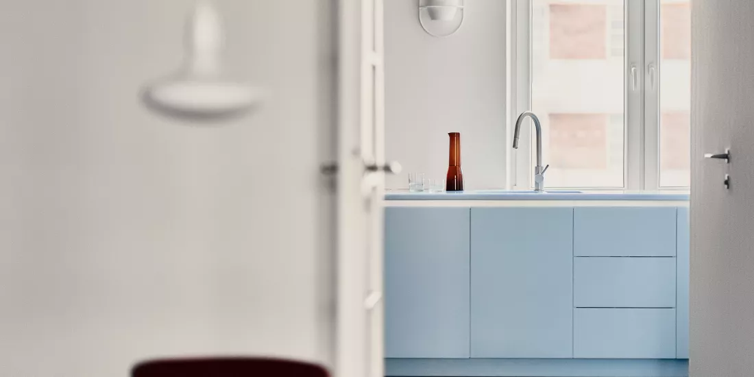 Một góc bếp hiện đại với thiết kế tối giản, sử dụng đá Hi-MACS tinh tế cho mặt bếp. Màu xanh pastel nhẹ nhàng của tủ bếp kết hợp cùng ánh sáng tự nhiên từ cửa sổ tạo cảm giác thanh thoát, trang nhã. Bề mặt đá Hi-MACS mang đến vẻ đẹp liền mạch, chống thấm và dễ vệ sinh, giúp không gian bếp luôn sạch sẽ và tiện dụng. Một chiếc bình thủy tinh màu nâu và vài chiếc cốc tạo điểm nhấn tinh tế, góp phần hoàn thiện phong cách thiết kế đơn giản nhưng đầy cuốn hút.